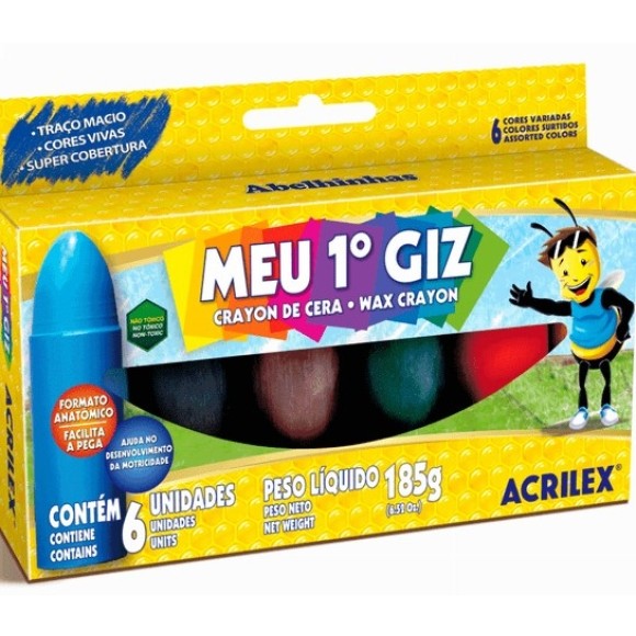 O Giz Meu 1° Giz De Cera 6 Cores Acrilex foi desenvolvido especialmente pela Acrilex para auxiliar a coordenação motora das crianças. Fabricado com cera de alta qualidade, proporcionando total cobertura e excelentes traços, dando vivacidade nos desenhos. Seu formato anatômico, é ideal para uso na pré-escola e em trabalhos escolares, pois auxilia no desenvolvimento da coordenação motora e estimula a criatividade.