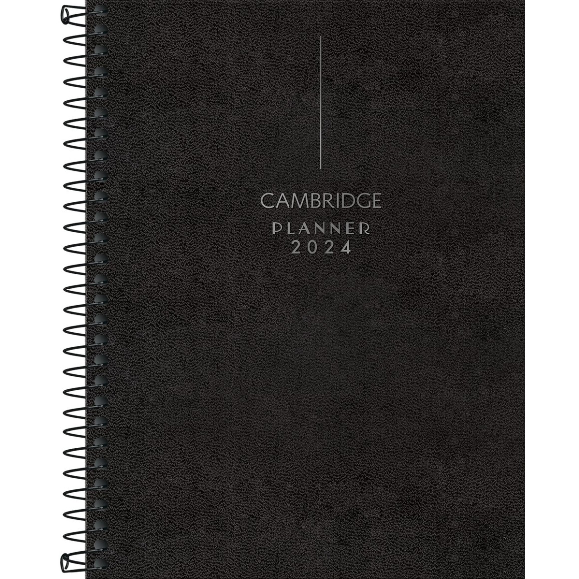 O Planner Espiral 17,7 x 24 cm Cambridge 2024 pode ser usado para organizar os compromissos do dia a dia em casa e no trabalho. O produto tem capa dura em material especial, espiral, bolsa plástica para guardar documentos e miolo, com visões anual, mensal e semanal, com 80 folhas, e gramatura 90 g/m².