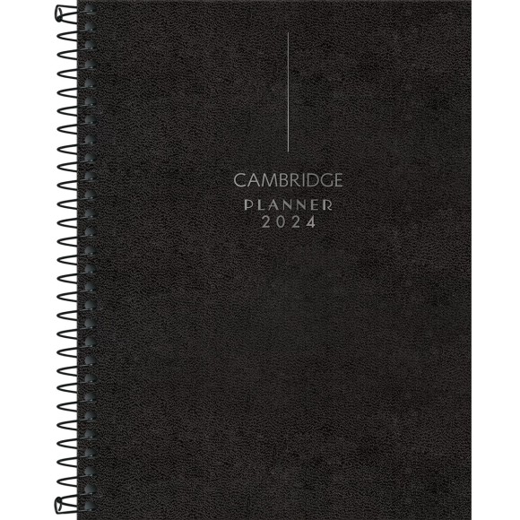 O Planner Espiral 17,7 x 24 cm Cambridge 2024 pode ser usado para organizar os compromissos do dia a dia em casa e no trabalho. O produto tem capa dura em material especial, espiral, bolsa plástica para guardar documentos e miolo, com visões anual, mensal e semanal, com 80 folhas, e gramatura 90 g/m².